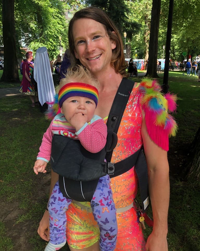 Hi, I'm Dylan Corvidae. To the left above is my child Kaon. Above center is my partner Elizabeth. To the right above is my partner Bentley. I'm polyamorous* and have two long-term partners, Elizabeth and Bentley. Elizabeth and I have been together for 12 years. Bentley and I have been together for 2 years, Bentley is also my acrobatic partner. Kaon is the newest addition to my flock and my first child. They were born in October of 2018. We are raising Kaon gender neutral until they decide if they want to participate in the whole gender concept for themselves.